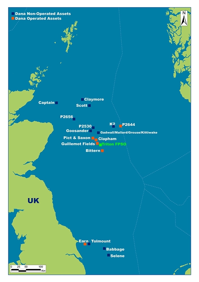 Our portfolio in the UK is made up of various exploration, production and development activities throughout the Northern, Central and Southern North Sea. Dana has interests in 16 producing oil and gas fields with 10 operated and 12 non-operated licences. Dana has interests in 9 decommissioning fields and 8 exploration licences with three discoveries in pre-development evaluation. Dana operates the Triton FPSO and the Western Isles FPSO (in wet storage).